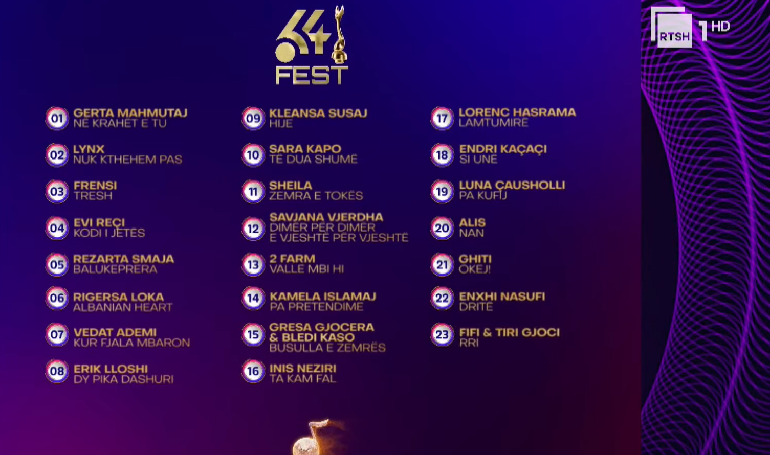 Në mbrëmjen e sotme garojnë 23 këngëtarë, ku njëri prej tyre do të triumfojë në çmimin e madh që do ta dërgojë për Festivalin Europian të Këngës.
